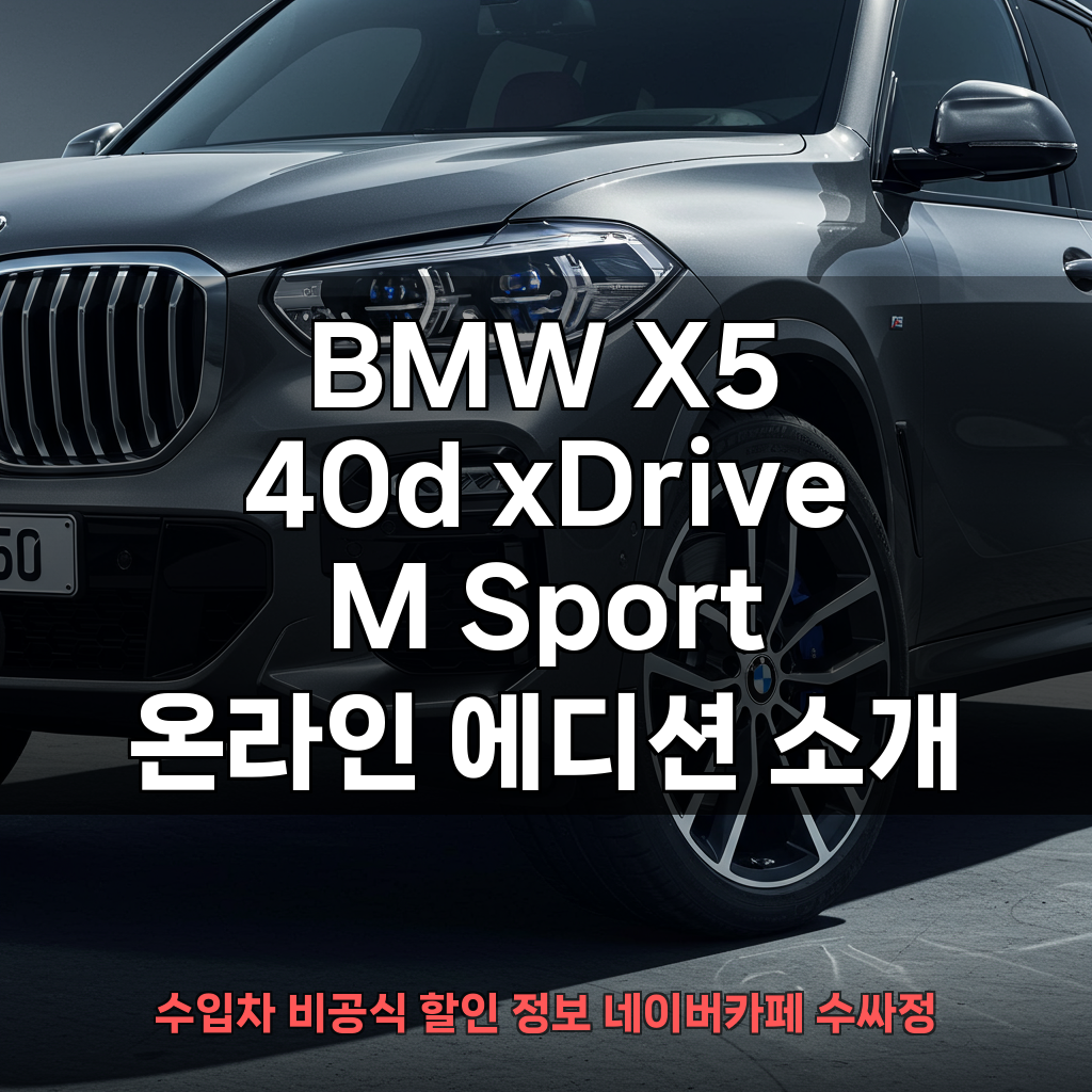 BMW X5 40d xDrive M Sport 온라인 에디션 소개BMW X5 40d xDrive M Sport 온라인 에디션은 강력한 성능과 독보적인 디자인으로 많은 이들의 드림카로 손꼽히는 모델입니다. 특히 이번 온라인 에디션은 특별한 외장 컬러와 M 스포츠 패키지를 통해 더욱 매력적인 모습을 선보입니다. 최대 출력 286마력과 최대 토크 66.3kg.m의 강력한 퍼포먼스를 자랑하며, 자동 8단 변속기와 풀타임 4륜 구동 시스템은 어떠한 주행 환경에서도 안정적이고 역동적인 주행을 지원합니다. BMW 레이저 라이트와 어댑티브 LED 헤드라이트는 야간 운전 시 최적의 시야 확보를 도와주며, 파노라마 선루프 스카이라운지는 고급스러운 실내 분위기를 연출합니다.특별한 디자인과 익스테리어 특징BMW X5 40d ..